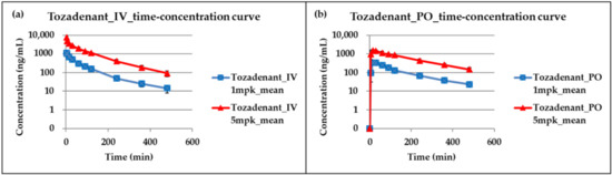 This LC-MS/MS method was successfully applied to a tozadenant pharmacokinetic study in rats, and Figure 3 shows the time-concentration profiles of tozadenant after intravenous and oral administration. Table 5 shows pharmacokinetic parameters calculated from this study. The results show that the increase in area under the curve (AUC) and maximum plasma concentration (Cmax) of tozadenant was dose-dependent at a single intravenous or oral administration at a dose range of 1 to 5 mg/kg, and the average oral bioavailability (F) was 69.43% in rats.