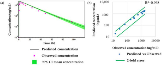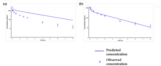 The first simulation using only the input parameters (Table 6) showed significant difference between the predicted and the observed value (Figure 4a). Specifically, the predicted AUClast value was much higher than the observed AUClast value. We confirmed that the clearance (Cl) and volume of distribution (Vd) values predicted from the first simulation showed no resemblance to the observed parameters. The Cl and Vd values from the observed PK data were 14.36 mL/min/kg and 1.63 L/kg, respectively, but the values from the predicted PK data were 0.422 mL/min/kg and 0.7 L/kg, respectively. The difference in the Cl value was considered to be due to the fact that Gastroplus™ predicted the in vivo Cl value based on the Clint, in vitro used as an input parameter and thus did not match the observed in vivo Cl value. Therefore, in order to match the in vivo Cl value, the kidney clearance was optimized as extra hepatic clearance [42,43]. Also, the difference of Vd value was optimized by optimizing the Kp (distribution coefficient) value of the liver and the kidney by using the optimization module in Gastroplus™. After optimization of Cl and Vd values, the predicted PK profile and parameters were similar to the observed PK profile and parameters (Figure 4b). Then, the optimized PBPK model was validated via other in vivo PK data, and the results are shown in Figure 5.