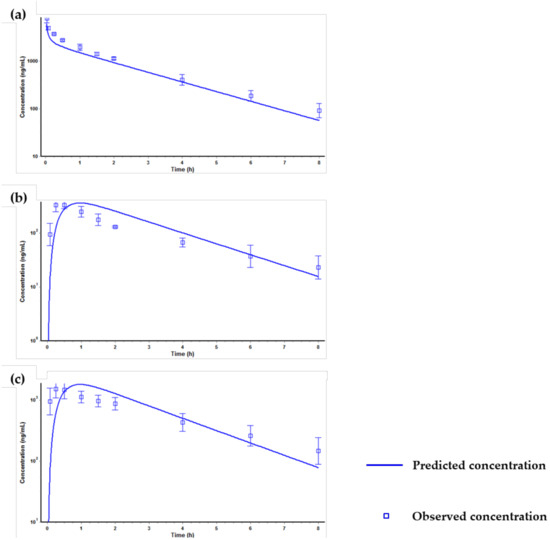 Predicted and observed time-concentration profiles of tozadenant after optimization, (a) intravenous administration at a dose of 5 mg/kg, (b) oral administration at a dose of 1 mg/kg, (c) oral administration at a dose of 5 mg/kg in rats.