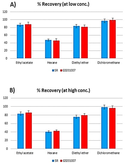 A bar graph showing the extraction solvent effect on the % recoveries of sofosbuvir (SR) and its metabolite GS331007 at low (A) and high concentrations (B).