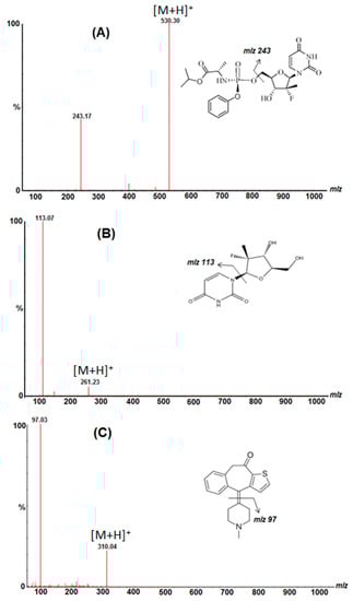 - Rezk, M.R.; Basalious, E.B.; Karim, I.A. Development of a sensitive UPLC-ESI-MS/MS method for quantification of sofosbuvir and its metabolite, GS-331007, in human plasma: Application to a bioequivalence study. J. Pharm. Biomed. Anal. 2015, 114, 97–104. [Google Scholar] [CrossRef]