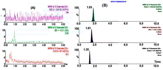 In order to achieve the best peak symmetry and intensity, several chromatographic conditions were tried including the variation of stationary as well as mobile phases; initially, we tried formic acid 0.1% in an aqueous solution with different ratios of methanol and acetonitrile separately as organic modifiers. It was found that acetonitrile provides better peak sensitivity than methanol (Supplementary Materials Figures S1 and S2). Acetonitrile as the organic modifier was then used with different buffer solutions such as ammonium acetate, ammonium formate and ammonium formate with the addition of 0.1% formic acid. The optimum peak sensitivity and symmetry were obtained using acetonitrile:5 mM ammonium formate:0.1% formic acid (85:15:0.1% v/v/v) as a mobile phase at a flow rate of 0.35 mL/min in an isocratic elution, and the separation was achieved on Acquity UPLC BEH C18 (50 × 2.1 mm, i.d. 1.7 µm, Waters, USA). SR, GS331007 and IS were eluted in a very short retention time—equivalent to 1.83, 1.61 and 1.35 min—which is advantageous for high-throughput screening in routine analysis and bioequivalence studies in human samples. Although SR, GS331007 and IS have very similar retention times, the accuracy and precision of the results remained unaffected because quantification was performed using multiple-reaction monitoring (MRM).