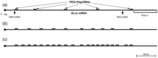 Positions in GLuc mRNA to which each PEG-OligoRNA hybridizes. (a) 5 PEG-OligoRNAs/mRNA. (b) 10 PEG-OligoRNAs/mRNA. (c) 20 PEG-OligoRNAs/mRNA. A scale bar shows the length of 100 nt.