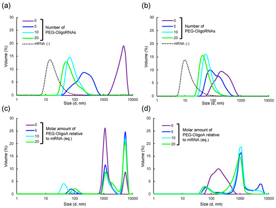 Dynamic light scattering measurement of Lipofectamine LTX/mRNA LNPs. Two LNP formulations were prepared by mixing mRNA with (a,c) minimal or (b,d) maximal volume of lipofectamine LTX solution that the manufactures suggest to use ((a,c) Lipo-Min and (b,d) Lipo-Max). (a,b) The size of the LNP without mRNA addition (mRNA (−)), and that loading mRNA hybridized with 0, 5, 10, or 20 PEG-OligoRNAs was measured. (c,d) PEG-OligoA was used as a control PEG-OligoRNA that does not hybridize to mRNA. 5 eq., 10 eq., and 20 eq. of PEG-OligoA relative to mRNA was added to mRNA for preparation of Lipo-Min and Lipo-Max.