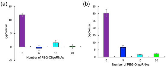 Then, LNP ζ-potential was measured to examine the degree of LNP PEGylation, which may influence the ζ-potential. Lipo-Min and Lipo-Max loaded with unhybridized mRNA exhibited high ζ-potential of +12 mV and +31 mV, respectively (Figure 4). The ζ-potential decreased after hybridization of mRNA with PEG-OligoRNAs, and the drop correlated with the number of PEG-OligoRNAs hybridizing to mRNA. Lipo-Min and Lipo-Max loading 20 PEG-OligoRNA showed almost neutral ζ-potential of +0.2 mV and +2.3 mV, respectively (Figure 4). Thus, the cationic surface charge of Lipofectamine LTX/mRNA LNPs was masked after hybridization of mRNA with PEG-OligoRNAs, indicating the successful PEGylation of the LNPs.
