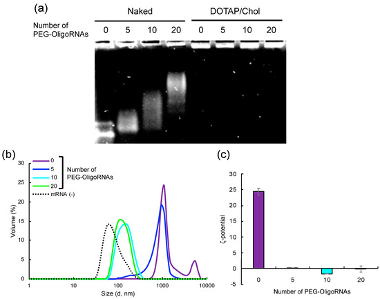 Characterization of DOTAP/Chol LNPs loaded with PEG-OligoRNAs/mRNA. (a) Gel electrophoresis of unhybridized mRNA and mRNA hybridized with 5, 10, or 20 PEG-OligoRNAs, in a naked form or after complexation with DOTAP/Chol liposomes. (b) The sizes and (c) ζ-potential of the DOTAP/Chol LNPs without mRNA addition (mRNA (−)), and that loading mRNA hybridized with 0, 5, 10, or 20 PEG-OligoRNAs were measured. n = 6 for (c). Data are presented as mean ± standard error of the mean.