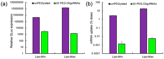 Introduction of Lipofectamine LTX/mRNA LNPs to cultured cells. Two LNP formulations were prepared by mixing GLuc mRNA with minimal or maximal volume of lipofectamine LTX solution that the manufactures suggest to use (Lipo-Min and Lipo-Max). LNP loaded with non-PEGylated mRNA and that loaded with 20 PEG-OligoRNAs/mRNA were transfected to HuH-7 cells. (a) GLuc protein concentration in the culture medium 4 h after the transfection. n = 6. (b) GLuc mRNA uptake to HuH-7 cells measured using qRT-PCR 4 h after the transfection. n = 4. Data are presented as mean ± standard error of the mean.