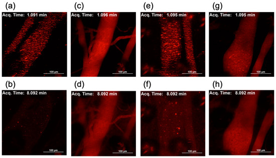 Intravital real-time confocal observation of Lipofectamine LTX-based LNPs in the blood. Using GLuc mRNA labeled with Cy5, two LNP formulations were prepared by mixing the mRNA with minimal or maximal volume of lipofectamine LTX solution that the manufacture suggests to use ((a–d) Lipo-Min and (e–h) Lipo-Max). Then, the LNPs was intravenously injected to the mice for observation of the blood vessel in the earlobes using intravital confocal microscopy. (a,c,e,g) Images 1 min after the injection. (b,d,f,h) Images 8 min after the injection. (a,b) Lipo-Min loaded with non-PEGylated mRNA. (c,d) Lipo-Min loaded with 20 PEG-OligoRNAs/mRNA. (e,f) Lipo-Max loaded with non-PEGylated mRNA. (g,h) Lipo-Max loaded with 20 PEG-OligoRNAs/mRNA.