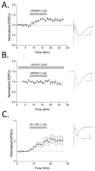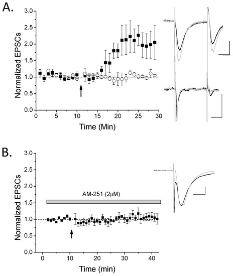 Whole cell voltage-clamp experimental methods similar to these were described previously [10]. Briefly, hippocampal CA1 oriens cells were visualized using an Olympus BX51WI microscope (Center Valley, PA, USA) with a 40× water immersion objective. Cells were patched with a glass pipette filled with internal solution composed of 117 mM cesium gluconate, 2.8 mM NaCl, 20 mM HEPES, 5 mM MgCl2, and QX-314 (Tocris) (pH 7.28, 275–285 mOsm). Polyamines were omitted from the internal solution as done previously by others examining oriens interneuron LTP [16] so that calcium permeable AMPA receptors known to be required for LTP were not under voltage-dependent block. Picrotoxin (100 µM; Abcam) was added to the ACSF recording solution to block GABAA receptor currents. AM-251, JZL184 and URB597 were purchased from Tocris (Bristol, UK). Cells were recorded in voltage-clamp at −65 mV. Stimulation to induce evoked synaptic transmitter release was accomplished using a concentric bipolar stimulating electrode placed in the stratum oriens layer near the cell recorded from to induce activation of glutamatergic axons including CA1 recurrent collaterals and potentially Schaffer Collateral inputs, along with other local neurotransmitter inputs. Stimulation ranged from 60 to 300 µA and evoked paired responses separated by 50 msec. Baseline and post-HFS stimulation was at 0.1 Hz for a 100 µsec duration to evoke EPSCs and the cell was recorded from for as long as possible. Baseline traces were acquired for approximately 10 min with no experiment going beyond ~12 min post-whole cell acquisition in order to avoid potential washout. Plasticity was induced using 2 stimulations at 100 Hz for 1 s (100 µsec stimulus duration), 20 s apart, while the cell was in current clamp mode, then recording resumed in voltage clamp mode. For all whole cell experiments, traces were recorded using Multiclamp 700B amplifier (Molecular Devices, Sunnyvale, CA, USA). Signals were filtered at 4 kHz and digitized with an Axon 1440A or 1550A digitizer (Molecular Devices) connected to a Dell personal computer with pClamp 10.2 or 10.5 Clampfit software (Molecular Devices). p-Values were obtained using a two-way unequal variance student’s t-test or ANOVA with p < 0.05 being considered significant, taken 10–15 min post-conditioning or drug application.