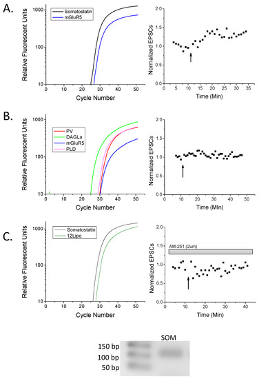 Real-time (RT)-PCR confirms somatostatin-positive (SOM+) rat hippocampal cells exhibit LTP. (A) An example SOM+ cell from Figure 1A that expressed type I metabotropic glutamate receptor 5 (mGluR5), and exhibited HFS-LTP. (B) An example parvalbumin-positive (PV+; somatostatin-negative) cell from Figure 1A that expressed diacylglycerol lipase (DAGLα), mGluR5, and n-acylphosphatidylethanolamine phospholipase D (NAPE-PLD, abbreviated PLD) that did not potentiate following HFS. (C) An example SOM+ neuron from Figure 1B expressing 12-lipoxygenase (12-lipo), that likely could have potentiated, but did not exhibit plasticity in the presence of the CB1 antagonist AM-251. Inset: Gel electrophoresis of the amplicon from the somatostatin (SOM) primers of the appropriate size with accompanying ladder in base pairs (bp). As a note, amplicons from all other primers have been published previously [10,29]. Trace color key: Black, somatostatin; blue mGluR5; lime green, DAGLα; red, parvalbumin; magenta, NAPE-PLD; forest green, 12-lipoxygenase.