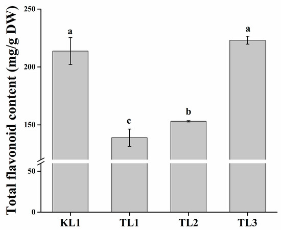 In this study, one tartary buckwheat variety “Xi-nong 9940” (KL1) and three common buckwheat varieties “Bei-zao-sheng” (TL1), “Xi-nong 9978” (TL2), and “Xi-nong 1351” (TL3) were selected as experimental varieties. The total flavonoid contents in the leaves of the four buckwheat varieties were investigated (Figure 1). The flavonoid content of TL3 was slightly higher than that of KL1 but the difference was not significant (p < 0.05), whereas it was significantly higher (p < 0.05) than that of TL1 and TL2, reaching 223.04 mg/g DW. The flavonoid content of the leaves from tartary buckwheat was the second highest at 213.66 mg/g DW. Moreover, the flavonoid content of TL2 was significantly higher (p < 0.05) than that of TL1. TL1 had the lowest flavonoid content of 138.95 mg/g DW.