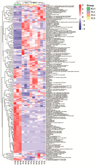 The flavonoid metabolites of the leaves from four buckwheat varieties were investigated based on UPLC-ESI-MS/MS and databases. In this study, 182 flavonoid metabolites were identified, including 53 flavone, 37 flavonol, 32 flavone C-glycosides, 24 flavanone, 18 anthocyanins, 7 isoflavone, 6 flavonolignan, and 5 proanthocyanidins (Supplementary Table S1). All flavonoid metabolites of the samples are shown in Figure 2 as a heat map after homogenization. In the heat map, the content of flavonoid metabolites in the KL1 contrasted with TL1, TL2, and TL3 varied greatly, whereas the contents of flavonoid metabolites among TL1, TL2, and TL3 were basically consistent. This finding was demonstrated by clustering analysis of the samples and showed that the tartary buckwheat was clearly distinguished from three common buckwheat varieties. Meanwhile, by clustering all flavonoid metabolites, more than half of the flavonoid metabolites content in KL1 were higher than those in TL1, TL2, and TL3.