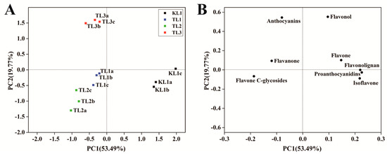PCA uses several principal components to reveal the internal structure between multiple variables. In this study, two principal components, PC1 and PC2, were extracted and were 53.49% and 19.77%, respectively; moreover, the cumulative contribution rate reached 73.26%. In the PCA score plot (Figure 3A), KL1, TL1, TL2, and TL3 were clearly separated, and the repeated samples were compactly gathered together, thus indicating that the experiment was reproducible and reliable. The distinct separation of KL1 from TL1, TL2, and TL3 indicated a large difference between them. In the PCA loading plot (Figure 3B), different classes of flavonoid metabolites were distributed in different quadrants. By comparing the score plot, it was found that anthocyanins, flavanones and flavone C-glycosides contributed greatly to TL1, TL2, and TL3, and other flavonoids contributed to KL1. The difference in the contents of these flavonoids might be responsible for the differences between tartary buckwheat and common buckwheat.