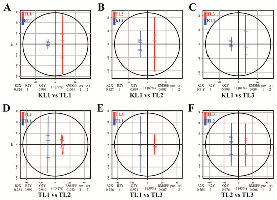 Differential flavonoid metabolite analysis on the basis of orthogonal signal correction and partial least squares-discriminant analysis (OPLS-DA). (A–F) OPLS-DA model plots for the comparison group KL1 vs TL1, KL1 vs TL2, KL1 vs TL3, TL1 vs TL2, TL1 vs TL3, and TL2 vs TL3, respectively.