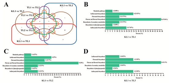 Venn diagram of differential flavonoid metabolites for each comparison group and KEGG classification results. (A) Venn diagram showed the overlapping and unique differential metabolites amongst the comparison groups. Circles with different shapes and different colors of red, blue, brown, purple, orange, and green represented different comparison groups of KL1 vs TL1, KL1 vs. TL2, KL1 vs. TL3, TL1 vs. TL2, TL1 vs. TL3, and TL2 vs. TL3, respectively. (B–D) The differential metabolites KEGG classification of the comparison group KL1 vs. TL1, KL1 vs. TL2, and KL1 vs. TL3, respectively.