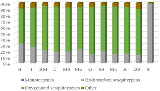 The cultivated sample “B” was rich in α-bisabolol oxide B (21.88%) and chamazulene (19.22%), while the percentages of these compounds were lower under the wild growth conditions. The blue colour of EOs in all samples except “S” represented their chamazulene contents, whereas, “S” due to lack of this compound showed a yellowish green colour. Accordingly, oxygenated sesquiterpenes (53.31–74.52%) were the predominant chemical group of EO constituents in all studied samples, excluding “S”, which was rich in sesquiterpene hydrocarbons (Figure 1).