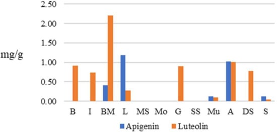 Methanolic extracts of samples “L” and “A” contained the highest amounts of apigenin, with 1.19 ± 0.01 mg/g and 1.02 ± 0.01 mg/g, respectively. Luteolin was present in higher concentrations in “BM” (2.20 ± 0.0 mg/g) and “A” (1.01 ± 0.02 mg/g) extracts (Figure 2).