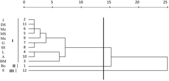 To characterize and identify the different chemotypes of Iranian M. chamomilla populations, their EO compositions and main flavonoids (apigenin and luteolin) were submitted to cluster analysis (CA) and principal component analysis (PCA). As shown in Figure 3 and Figure 4, the dendrograms allowed separating the M. chamomilla populations into three main groups, each representing a distinct chemotype.