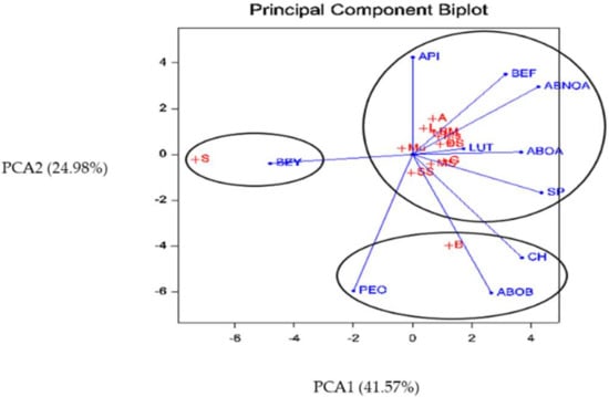 Principal component analysis (PCA) of the Matricaria chamomilla populations. ABOA: α-bisabolol oxide A, ABOB: α-bisabolol oxide B, PEO: percentage of essential oil, CH: chamazulene, SP: (E)-spiroether, ABNOA: α-bisabolone oxide A, BEF: (E)-β-farnesene, BZY: (Z)-γ-bisabolene, BEY: (E)-γ-bisabolene, LUT: luteolin, API: apigenin.