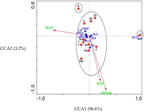 In order to assess the effect of environmental factors on EO components, along with apigenin and luteolin contents, canonical correspondence analysis (CCA) was applied based on a matrix of three environmental factors including altitude, mean annual temperature (MAT), and mean annual precipitation (MAP) [] and major EO compounds, along with apigenin and luteolin contents (Figure 5).