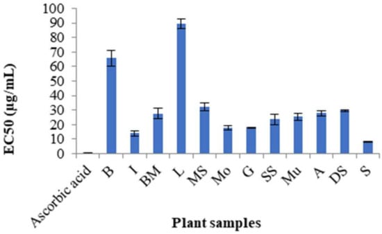 In a similar study, methanol extracts of M. chamomilla yielded from different samples indicated more potent antiradical activity than EOs analysed by the DPPH test, due to polyphenols present in extracts; although, they possessed a moderate effect in comparison with the standards [].
