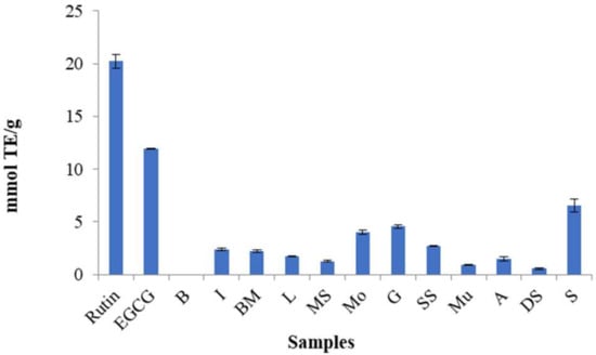 Twelve extracts were subjected to ORAC assay [] with slight modifications. Microtiter plates (96-well) were used for measurement of the samples. Briefly, 20 µL of extracts (0.01 mg/mL) was mixed with 60 µL of AAPH (peroxyl free radical generator) (12 mM) and 120 µL of fluorescein solution (70 mM). Then, the fluorescence was measured for 3 h at 1.5-min cycle intervals with the microplate reader. The standard Trolox® was used. Activity of all samples was compared with rutin and EGCG as positive controls. Antioxidant capacities were reported as μmol TE (Trolox® equivalents)/g of dry matter.