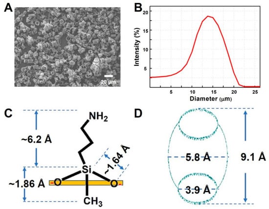 As we reported in our previous study, cucurbituril-based diatom composites (CB–DA) exhibit a strong host–guest interaction that supports molecular encapsulation [11]. An efficient method for fabricating CB–DA to diagnose pathogen is proposed in this study. By examining the DE using scanning electron microscopy (SEM) (JEOL JSM-7500F, Tokyo, Japan) and dynamic light scattering (DLS) (DynaPro NanoStar, Wyatt), we confirmed that the size of the DE particles was well distributed between 10 and 20 μm—an appropriate size range for this project (Figure 1A,B). APTES (3-aminopropyl-triethoxysilane)-modified DE (also known as DA) has an enhanced pathogen enrichment property [11]. Here, we focus on DE surface medication with the similar chemical of diethyl amino polydimethylsiloxane (3-aminopropyl-methyl-diethoxysilane (APDMS)) [12]. The structural formula of APDMS is shown in Figure 1C, and the chain length of the organic amino compound can be seen. A diagram of cucurbit[6]uril [18,19] with a portal diameter of 3.9 Å, a cavity diameter of 5.8 Å, and a height of 9.1 Å is shown in Figure 1D.