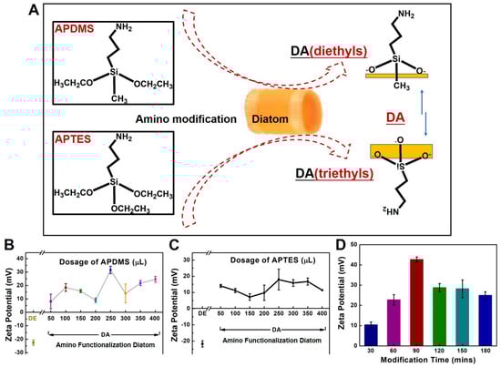 (A) Schematic of the process flow for amino functionalization of diatomaceous earth (DA). The diatom substrate was modified with either 3-aminopropyl-methyl-diethoxysilane (APDMS) or 3-aminopropyl-triethoxysilane (APTES). (B,C) Optimized conditions for amino functionalization of DE via APDMS (diethyls) and APTES (triethyls). Doses (μL) of APDMS and APTES reacted with 500 μL, 50 mg. L−1 DE in 1.5 mL tubes for 120 min. (The volume ratios ranged from 1/11 to 8/18.) APDMS and APTES (50 μL to 400 μL) were tested serially. (D) Optimization of the APDMS modification time. The zeta potentials of DA products with different APDMS modification times ranging from 30 to 180 min.