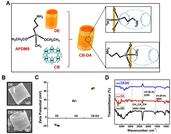 A schematic representation of the cucurbituril coating of APDMS-modified DE (CB–DA) is shown in Figure 3A. The two free chains of the APDMS on the substrate are encapsulated in the cavity of the cucurbit[6]uril (CB), which is a key property of this second DE surface modification. Chemical-optical spectrum analysis of the composites was performed to assess the modification status. SEM images were used to assess the morphology of the DE and CB–DA, as shown in Figure 3B. The pores on the DE surface are open, and the pore diameter is less than 100 nm (Figure 3B, top). However, the CB–DA is rougher with blocked pores on the surface (Figure 3B, bottom). To assess the electrostatic properties of the CB–DA in solution, the zeta potentials of the CB–DA were measured (Figure 3C). Due to the uniform size of the DE particles, we ignored the size effect on the surface charge. Notably, the zeta potential of the CB–DA composite was higher than that of the DA, likely reflecting the diverse anchor bindings between the DA and CB, which may include the reported possible anchor linking/ion-dipole interaction between the carbonyl groups of the CB portals. Furthermore, the positively charged amine groups in the CB–DA composite could enhance the absorbency efficiency of the CB–DA conjugate during its interaction with other molecules via enhanced covalent bonding, physical adsorption, electrostatic interaction, and heterogeneous surface binding [11,19,20,21]. In the Fourier-transform infrared (FTIR) spectrum analysis of the composite (Figure 3D), the absorption peak at 1450 cm−1 was attributed to asymmetric stretching vibrations in the Si–O–Si bonds, and the peak at 1410 cm−1 resulted from the Si–CH2 bond (black curve). In addition, the absorption peaks at 3295 and 1180 cm−1 can be attributed to Si–OH and C–N bonding, respectively, on the surface of the pure DE. After the surface modification to form DA, the well-defined absorption bands at 1100, 2250, and 2720 cm−1 represent C–C–C bonding, C–H bonding, and O–H bonding, respectively. The stretching vibrations at 2850–3000 cm−1 from the CH, CH2, and CH3 groups and that at 2720 cm−1 from the aldehyde (C–H) in the CB–DA group (blue curve) verified the presence of a CB–DA supermolecule.