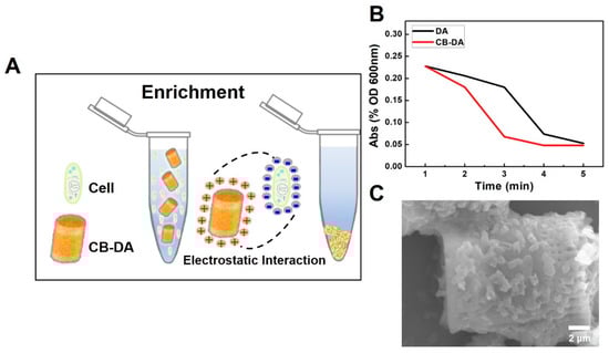 Pathogen enrichment schematic and demonstration. (A) Enrichment schematic; the electrostatic interaction between the positive surface of the CB–DA and the negative charge from the cell membrane. (B) The supernatant absorbances of the tested pathogen samples after DA and CB–DA E. coli enrichment (CFU 106, 2 mL). (C) Cell enrichment demonstration. SEM images of the HCT-116 cells adhered to the surface of CB-DA.