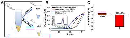 (A) A diagram of the supernatant and precipitate from the enrichment system. (B) Fluorescence signals from real-time PCR analyses of amplified DNAs extracted from the supernatant and precipitate following E. coli enrichment (CFU 104, 1 mL) using a Qiagen kit (100 μL of the tested sample). The inset figure shows the melting-curve plots representing the amplification products from the systems. Black line—104 CFU in 100 μL as a positive control; red line—supernatant with CB–DA addition, 100 μL; blue line—enrichment from CB–DA (100 μL of precipitate); and green line—distilled water (DW) as a negative control. (C) Zeta potential-based comparison of the nucleic acid capture efficiencies of the composites, i.e., DA-DNA and CB-DA-DNA.