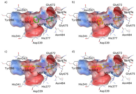 For the structure-based design of novel GP inhibitors, we examined the co-crystal structure of 2 bound to GP (PDB entry 3G2N) [9]. As is visible in Figure 3a, the glucopyranose moiety forms a network of hydrogen bonds with the amino acid residues His377, Asn484, Glu672 and Gly675 whereas the phenyl group points into a spacious cavity (β-channel) that provides sufficient room for further ligand growing. We hypothesized that an aromatic ring attached in para position of the phenyl group can interact with His341 by aromatic interactions for inhibitor enhancement. The 4-fluorophenyl unit in the meta position was intended to populate the β-channel and engage in constructive interactions with the amino acids Asn282 and His341 in close proximity. The strategic placement of a single fluorine atom is reported to have also positive effects on the pharmacokinetic profile of drug molecules, and by the formation of hydrogen bonds it can contribute to elevated inhibitor potency [10,11,12,13,14]. We performed docking experiments applying pharmacophore queries for the conservation of the hydrogen bonds formed by the glucopyranose residue and to maintain optimal ligand orientation.