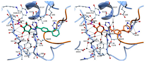 The synthesized compounds were examined in in vitro assays to determine their inhibitory potential against GP. Inhibition constant (Ki) values were measured using hlGPa (the pharmacologically relevant target) and the rabbit muscle enzymes (rmGPa and rmGPb) for comparison reasons since previously reported Ki values for other inhibitors were determined for the rabbit muscle enzymes. Production of rmGPa, rmGPb, and hlGPa, as well as enzyme kinetics experiments were performed according to previously described protocols [15]. As depicted in Table 1, both compounds 3 and 4 could be identified as GP inhibitors. They displayed competitive inhibition with respect to the substrate Glc-1-P (kinetics plots are presented in the Supplementary Materials, Figure S1). Within the series of tested molecules, 4 proved to be the most potent inhibitor with a Ki of 9.7 μM against rmGPb and 19.4 μM against the pharmacologically relevant hlGPa. Compared with the co-crystallized ligand 2 (PDB 3G2N), which was used for the design of the novel compounds, inhibitor 4 displayed elevated potency by almost one order of magnitude.