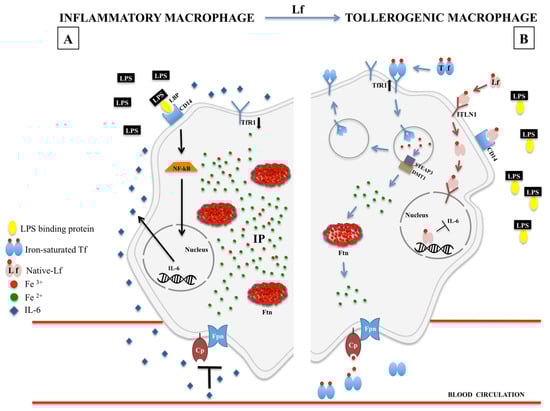 Iron homeostasis in LPS-inflamed macrophages, in the absence (A) or presence (B) of lactoferrin. (A) LPS stimulation, triggered by LPS-binding protein (LBP) and CD-14, induces the nuclear translocation of cytoplasmic NF-κB which in turn induces IL-6 synthesis. Serum IL-6 down-regulates Fpn/Cp axis, inhibiting iron export from the macrophage to blood circulation. Consequently, the increase of intracellular iron pool (IP) triggers the up-regulation of intracellular Ftn and the down-regulation of TfR1 expression thus hindering additional intracellular iron accumulation. (B) Lf-mediated inflammatory-to-tolerogenic macrophagic shift. Lf is internalized by ITLN1-mediated endocytosis and translocated into the nucleus where it inhibits IL-6 synthesis. As a cascade, the inhibition of IL-6 synthesis restores Fpn/Cp-mediated iron export from the macrophage to blood circulation. Consequently, the decrease of intracellular IP triggers either the inhibition of Ftn synthesis and the up-regulation of TfR1, thus restoring the physiological iron balance between reticuloendothelial system and blood. LPS: lipopolysaccharide; LBP: LPS binding protein; NF-κB: nuclear factor-κB; IL-6: interleukin-6; IP: iron pool; Fpn: ferroportin; Cp: ceruloplasmin; Ftn: ferritin; Tf: transferrin; TfR1: transferrin receptor 1; Lf: lactoferrin; ITNL1: intelectin-1; STEAP3: six-transmembrane epithelial antigen of the prostate 3; DMT1: divalent metal transporter 1.