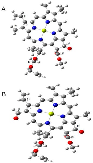 The chlorophyll model used in the calculations closely resembles the structure of chlorophyll, with the single difference being the replacement of the phytyl tail of chlorophyll by CH2CH=CH2. Our chlorophyll a model (Figure 1A) contains all three carbonyl groups (131-keto, 133 and 173-ester groups) and the chlorophyll f model (Figure 1B) also contains the extra carbonyl group (21-formyl group) [,]. The frequency calculations were carried out for the ground and first singlet excited states of chlorophylls a and f, corresponding to the Qy transitions.