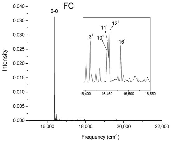 Calculated vibronic absorption spectrum of chlorophyll a using the B3LYP functional and 6-31G(d) basis set, including the FC contribution. The inset magnifies the 16,395–16,550 cm−1 region of the spectrum associated with assigned vibronic transitions.
