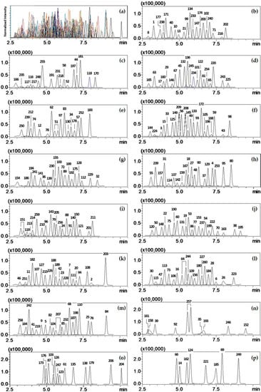 TIC obtained by MRM mode of LC-MS/MS at LOQ (10 ng/mL). (a) Chromatograms for 260 pesticides in urine sample (4 µL injection); (b) to (p) Individual chromatograms separated from (a). Pesticide numbers assigned on the peaks and their MRM transitions (quantifier) are designated in Table 3.