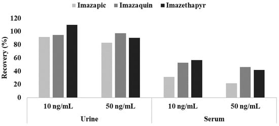 For imidazolinones (imazapic, imazaquin, and imazethapyr), their recoveries were superior to those in our previous study using the same preparation in serum samples (Figure 2). Because imidazolinones are zwitterions, ion suppression is required using acidic buffers to improve extraction efficiencies in serum [35]. Urine, however, is generally acidic, so imidazolinones were fully extracted without the help of buffer reagents.