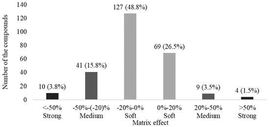 To summarize and evaluate matrix effects, the results of the 260 pesticides in Table 4 were classified into three groups defined by six ranges including a soft effect (matrix effect within −20% to 0% or 0% to 20%), medium effect (−50% to −20% or 20% and 50%), and strong effect (below −50% or above 50%) based on the reports of Kmellár et al. [50] and Ferrer et al. [51] (Figure 3).
