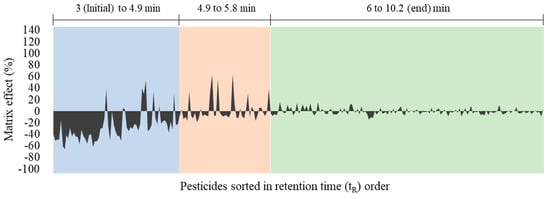 For verification of the matrix effect for each pesticide and correlation with retention time, a graph of matrix effects ordered by tR is shown in Figure 4. From the initiation time of pesticide elution to around 4.9 min, a large number of pesticides showed the matrix effect below -20%. In contrast, during tR of 4.9 to 5.8 min, signal suppression was reduced but some pesticides showed signal enhancement with matrix effects >20%. Matrix effects weakened after approximately 5.8 min through the end of the elution time. This result indicates that most of the polar urinary matrices co-eluted with target pesticides in the early stages of the analytical time (~5.8 min), causing considerable signal suppression/enhancement of target compounds.