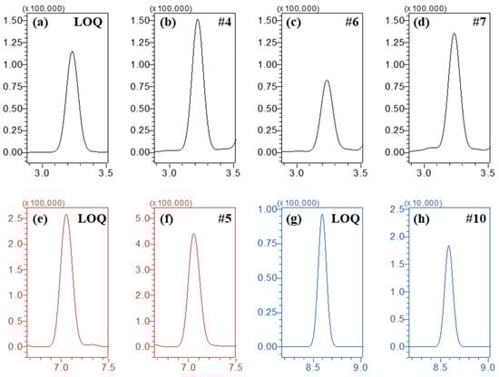 Chromatograms of (a–d) imidacloprid from QC (LOQ) and agricultural workers (#4, #6, and #7), (e,f) difenoconazole from QC (LOQ) and agricultural workers (#5), and (g,h) chlorfluazuron from QC (LOQ) and agricultural workers (#10). MRM transitions in the chromatograms were 255.8 > 209.0 (imidacloprid), 406.0 > 250.9 (difenoconazole), and 539.8 > 382.8 (chlorfluazuron), respectively.