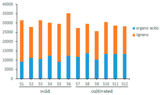 Twelve batches of cultivated and wild wuweizi were collected from Heilongjiang, Jilin, and Liaoning and dealt with using the same processing method (sun drying). Sample information is listed in Table 3. The validated analytical method of UFLC-QTRAP-MS/MS was successfully applied to the simultaneous determination of 11 lignans and 4 organic acids in wuweizi. Each sample was determined three times and the quantitative results of 15 compounds are presented in Table 4. Total ion chromatograms of the representative wild and cultivated samples are shown in Figure S1. Typical MRM chromatograms are shown in Figure 1. The histogram (Figure 2) suggests lignans were found in higher concentrations in wild than cultivated-type. However, the content of organic acids was slightly higher in the cultivated-type. It was clearly shown that the total contents of 15 compounds varied from 25,598.77 μg/g to 35,179.73 μg/g. The total contents of each type of constituent was also calculated, and 11 lignans ranged from 14,960.30 μg/g to 22,853.62 μg/g, and in the following order: (highest) S1 (wild) > S6 (wild) > S3 (wild) > S5 (wild) > S4 (wild) > S10 (cultivated) > S2 (wild) > S8 (cultivated) > S7 (cultivated) > S11 (cultivated) > S9 (cultivated) > S12 (cultivated) (lowest). The four organic acids ranged from 9075.64 μg/g to 13,646.81 μg/g. By comparing the amounts, it was found that the compounds of wuweizi from different ecosystems were quite different. In this study, the contents of lignans were similar to previous studies [4,15,16,17,18]. However, the contents of organic acids were slightly lower than the reported, which may be related to the harvest period, processing, and origin [19].