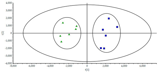 The selected initial data was further processed by PLS-DA in order to reveal differences in the chemical composition among wild and cultivated wuweizi. The results were shown in Figure 4. Model parameters were set as follows: confidence level was 95%, R2Y = 0.967, and Q2 = 0.924, and the parameters showed that the established PLS-DA model was effective. The PLS-DA score plot displayed that the two clusters representing the wild and cultivated groups were well separated, thereby indicating the remarkable differences between the two types.