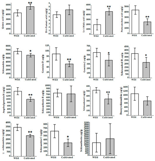 The contents of 15 compounds in wild and cultivated wuweizi (* p < 0.05; ** p < 0.01).
