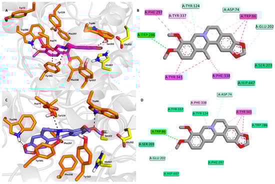 Top-scored docking poses for docking results for 1 and 2 within hAChE active site (PDB ID: 4EY6). (A,C)—superimposed analogue 1 and 2 in purple and blue, respectively, as three-dimensional (3D) figures; (B,D)—two-dimensional (2D) representation of 1 and 2, respectively. Generally, in (A,C)—important amino acid residues involved in the ligand-enzyme interactions are displayed as orange carbon atoms; catalytic triad residues (Glu202, Ser203, His447) are shown in yellow, and the rest of the enzyme is represented as light-grey cartoon. (B,D) were created with Discovery Studio 2016 Client software; (A,C) were generated with PyMol 1.5.0.4 (The PyMOL Molecular Graphics System, Version 1.5.0.4 Schrödinger, LLC, Manheim, Germany).