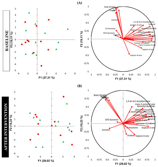 Multivariate analysis showed a high inter-individual variation of the data (Figure 2). Principal component analysis (PCA) plots explained 46.42% and 44.25% of variations at baseline and after the intervention, respectively. No separation was observed either before or after the intervention. At baseline, anthropometric indices (age, height, body weight) had an influence on d-limonene and acetone concentrations. The level of linalool was associated with the time of GFD adherence. Similar associations were not observed after the intervention (Figure 2).