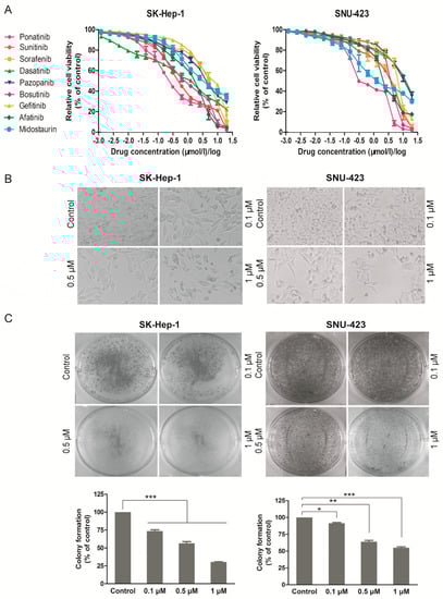 Efficacy of individual PTK inhibitors against different hepatocellular carcinoma (HCC) cell lines and cytotoxicity of ponatinib. (A) Cell proliferation was examined by 3-(4,5-dimethyl-2-thiazolyl)-2,5-diphenyl-2-H-tetrazolium bromide (MTT) assay. HCC cell lines including SK-Hep-1 and SNU-423 cells were seeded in 96-well plates and then treated with different concentrations of drugs for 72 h. The relative cell viability was calculated and shown. (B) Cell proliferation inhibition was observed by microscopy (×100). SK-Hep-1 and SNU-423 cells were plated in 24-well plates and exposed to indicated doses of ponatinib for 36 h. (C) SK-Hep-1 and SNU-423 cells were plated in six-well plates (500 cells/well) and treated with various concentrations of ponatinib for 10 days, then the clonogenic ability was measured and shown. The bars indicate the colony formation ability of different groups. Each experiment was carried out three times. (n = 3; *, p < 0.05; **, p < 0.01; ***, p < 0.001).
