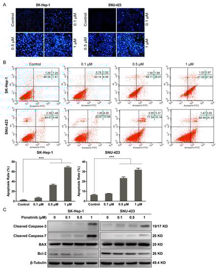 Ponatinib induced cell apoptosis in SK-Hep-1 and SNU-423 cells in a concentration-dependent manner. (A) SK-Hep-1 and SNU-423 cells were stained with Hoechst 33342 observed on fluorescence microscopy (×200). (B) Flow cytometry analysis of apoptosis (data from three independent experiments). (C) Western blot analysis of cleaved caspase-3, cleaved caspase-7, Bax, Bcl-2, and β-Tubulin (control) in treated cells.