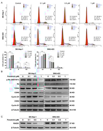 Effect of Ponatinib on the percentage of cells in the G1 phase and the expression of G1 phase-related proteins. (A) SK-Hep-1 and SNU-423 cells were treated with ponatinib, and cell cycle distribution was analyzed by flow cytometry. The percentages of cells in cell cycle phases were calculated from three independent experiments. (B) Western blot analysis of Rb/p-Rb, CDK4, CDK6, Cyclin D1, CDK2, Cyclin E1, and β-Tubulin (control) in the SK-Hep-1 and SNU-423 cells treated with ponatinib. (C) The effect of ponatinib on the concentration of Rad51 in SK-Hep-1 and SNU-423 cells.
