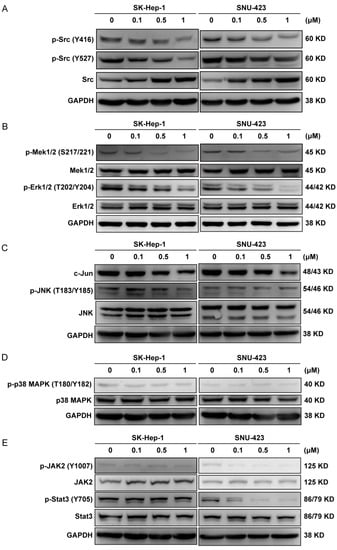 Hepatocellular carcinoma (HCC) is a major cause of morbidity and mortality worldwide []. Despite rapid progress in liver transplantation, resection, radiofrequency ablation, and chemoembolization, only one third of patients with HCC are suitable for these treatments []. HCC is also one of the most chemo-resistant tumors because little survival benefits or tumor responses have been received with many agents []. Three small molecule kinase inhibitors, sorafenib, regorafenib, and lenvatinib, have been approved as targeted therapy for advanced stages of HCC for their effects in increasing survival and delaying tumor progression [,,]. All these drugs work mainly as vascular endothelial growth factor receptor (VEGFR) inhibitors to block angiogenesis. However, their use was restricted due to the drug resistance and intolerance. Furthermore, in the past few years, multiple clinical trials with drugs targeting the fibroblast growth factor receptor (FGFR), the VEGFR, the platelet-derived growth factor receptor (PDGFR), the epidermal growth factor receptor (EGFR), the insulin-like growth factor 1 receptor (IGF-1R), the mechanistic target of rapamycin (mTOR), and the transforming growth beta (TGFβ) signaling pathways have been conducted, but none have been shown to be effective in improving patient survival []. The molecular pathogenic mechanism of HCC is very complicated, involving up-regulation of Ras/Raf/Mek/Erk and phosphatidylinositol 3-kinase (PI3K)/Akt/mTOR signaling transduction pathways and aberrant expression of receptor tyrosine kinases []. For any signaling inhibitor to be developed into an anticancer drug, it is critical to understand its molecular mechanisms of action and its effects on oncogenic processes and normal physiological processes.